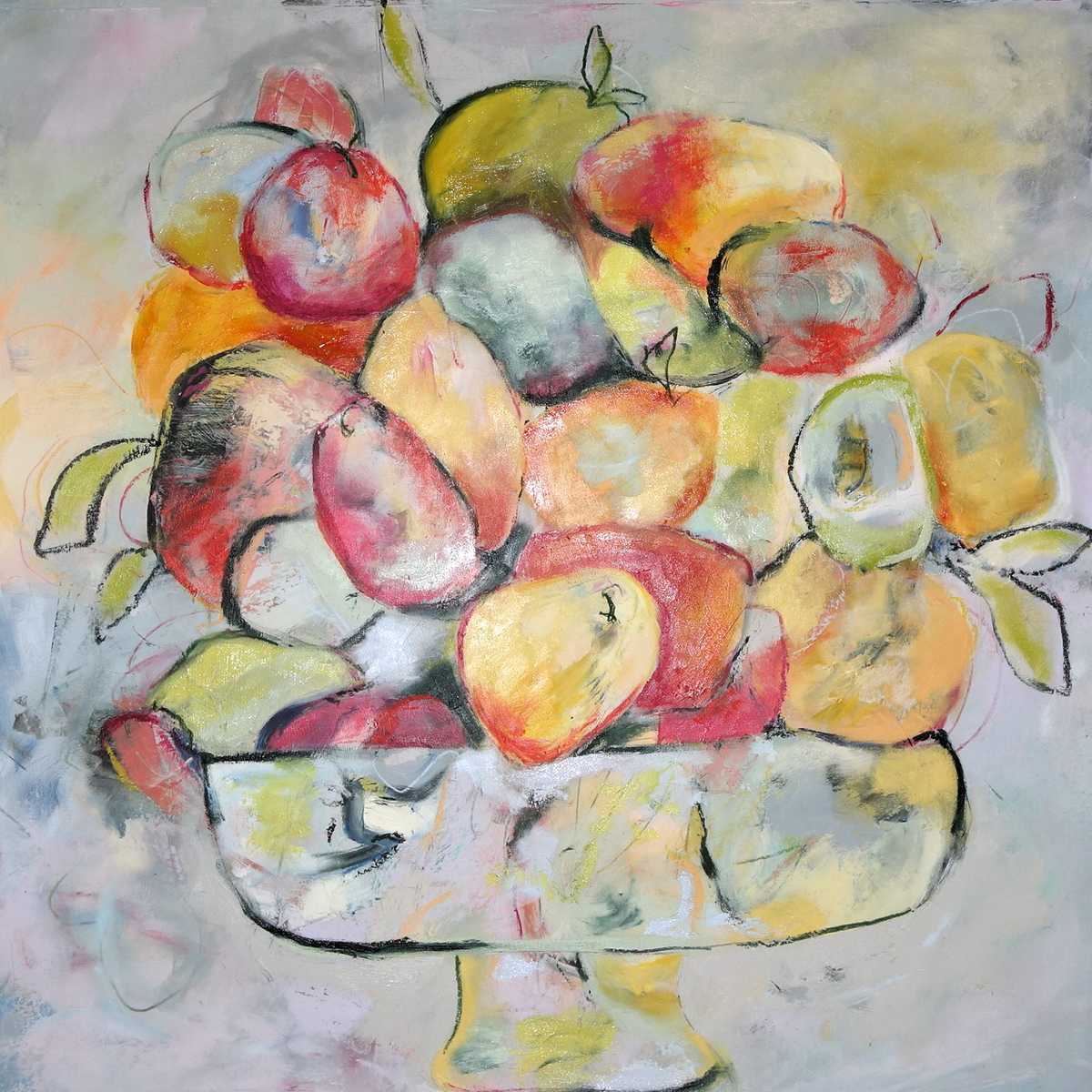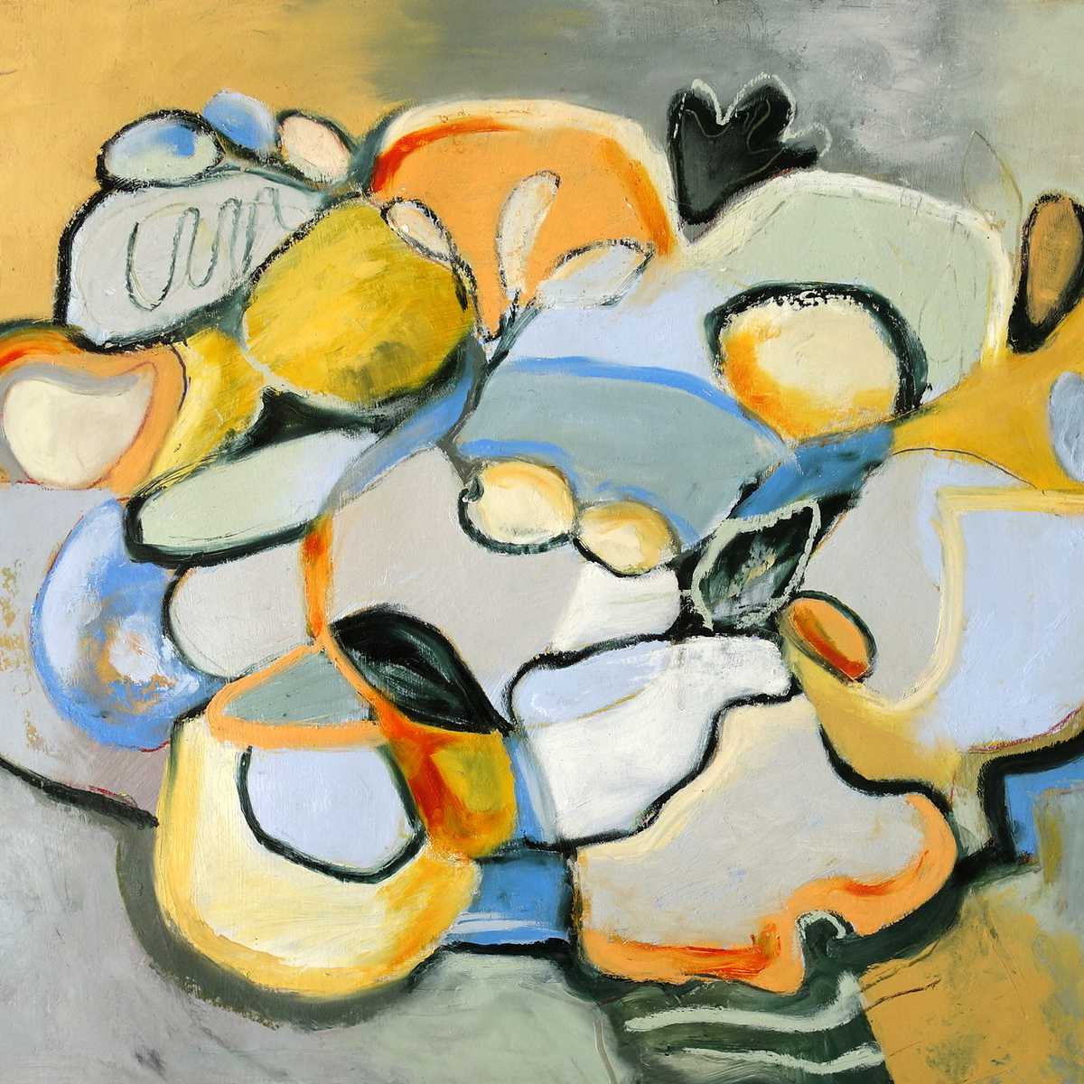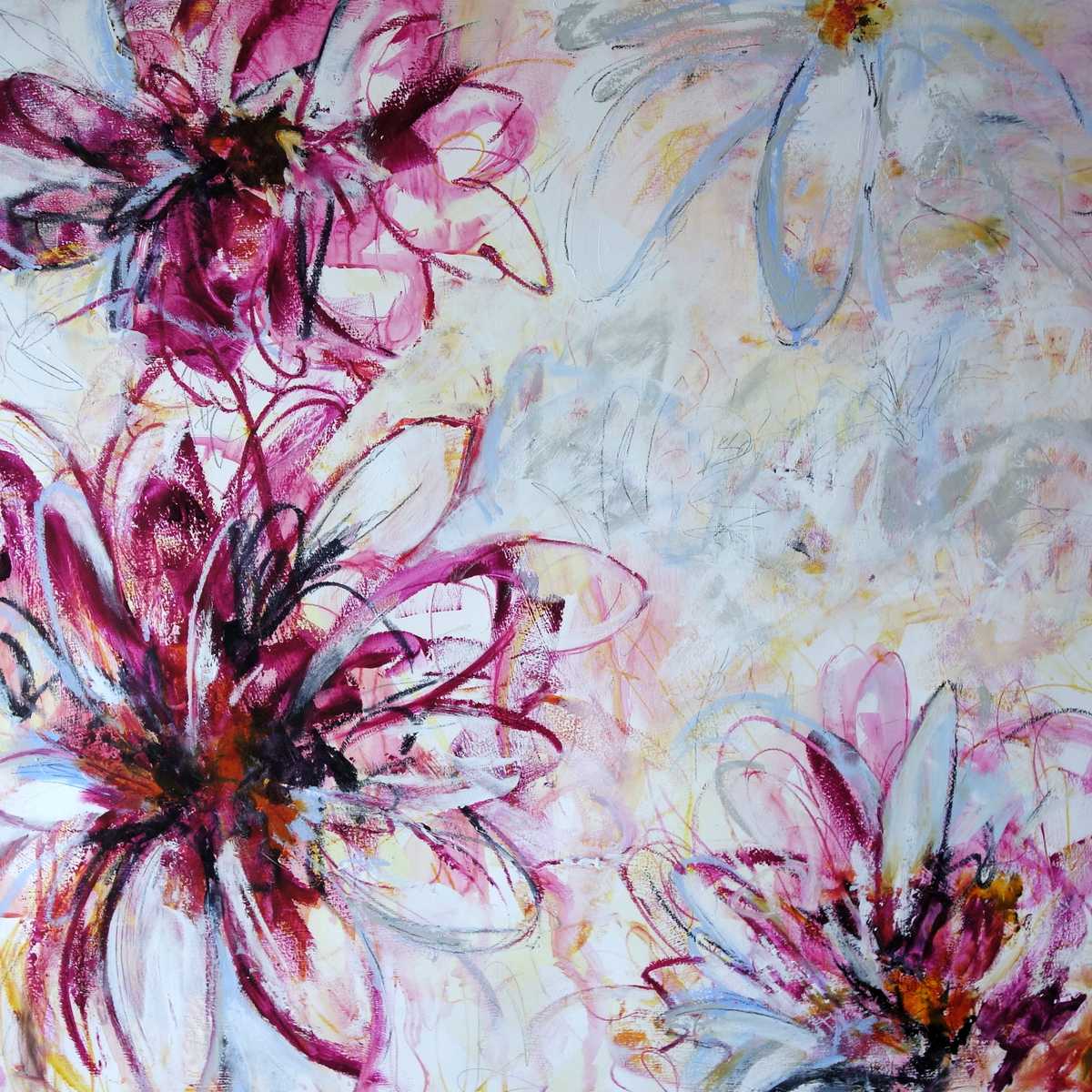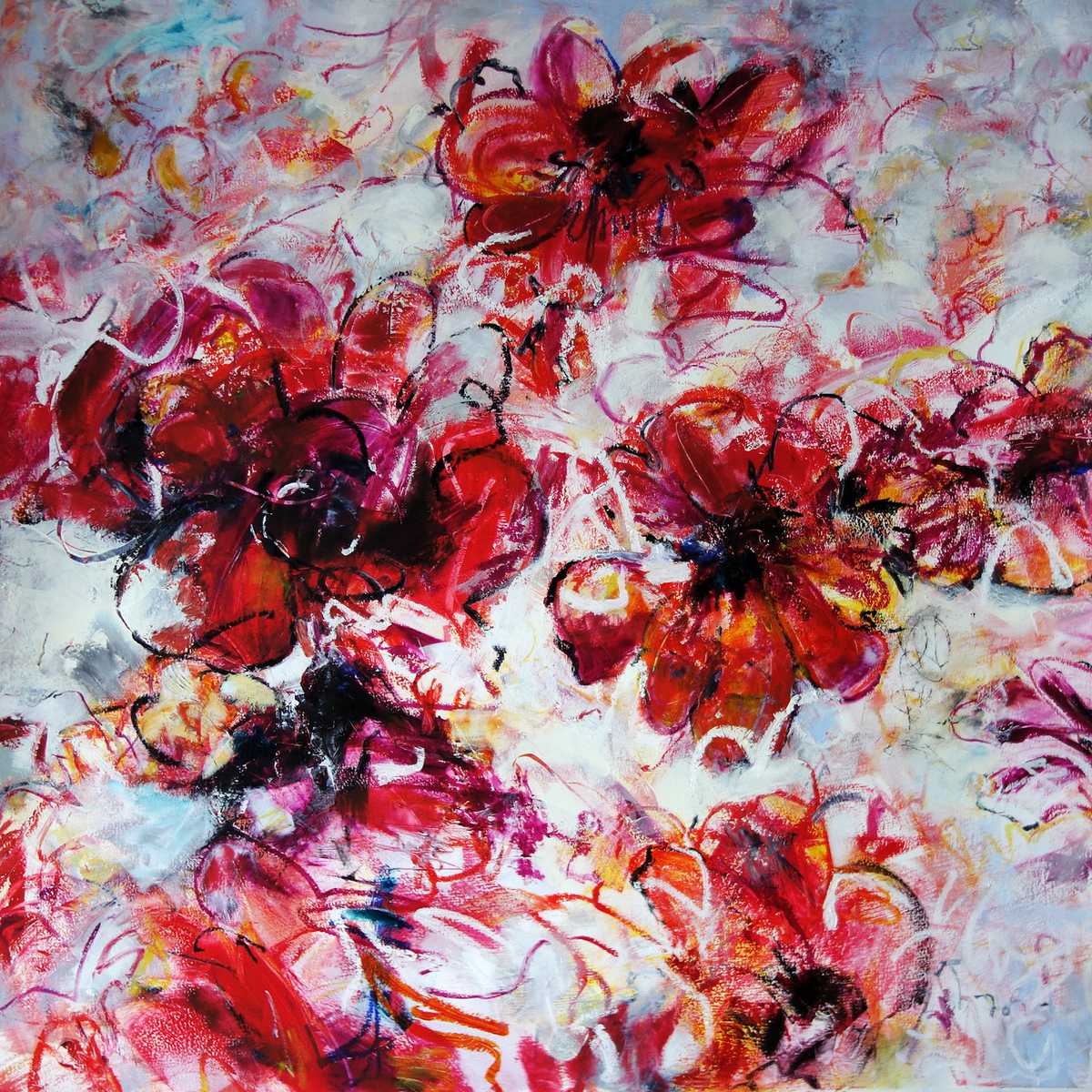 The joyful feeling of intuitive sweeping floral images created with a limited palette is addictive. I start with loose organic drawing in water soluble crayons softened with a wet brush. Oil stick then become the main media building layers of line and texture. These works are mainly large 80cm squares.