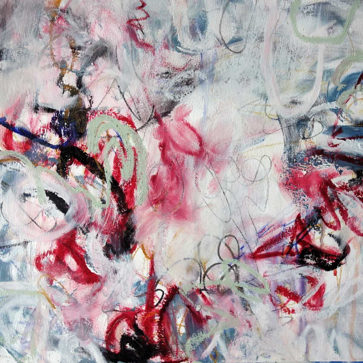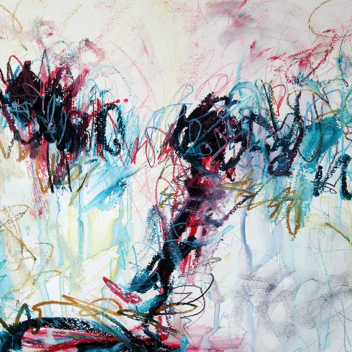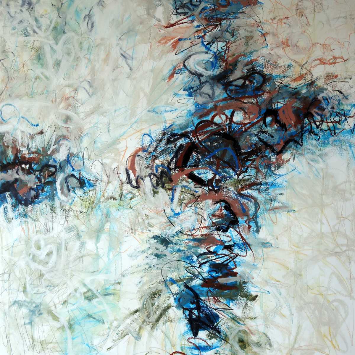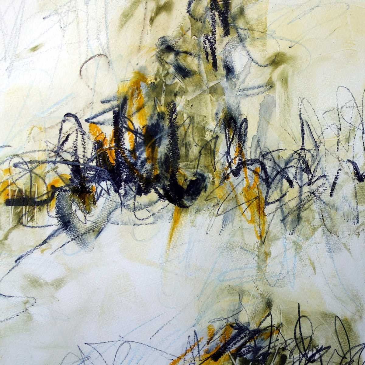 Working in a larger format on a wall allows use of my whole body to create gestural lines and marks. As usual I build up lots of layers of subtle lines and marks using a pre-determined limited palette. I work with a vague structure to get started. Oil sticks predominate, but crayons, oil pastels, oil paint with cold wax medium are also used.