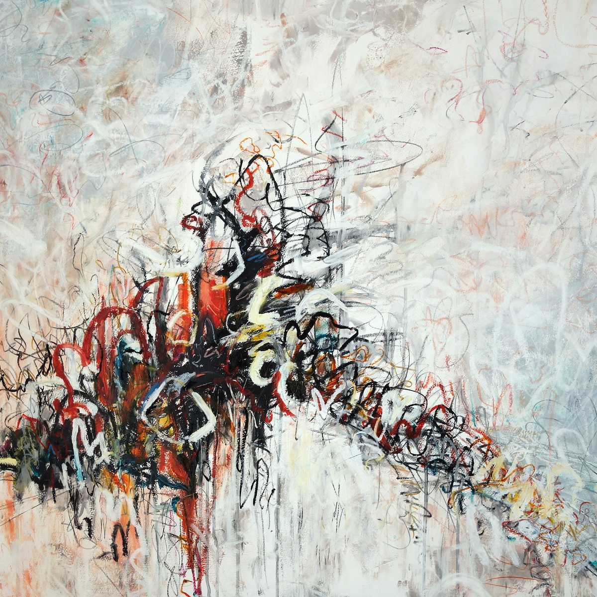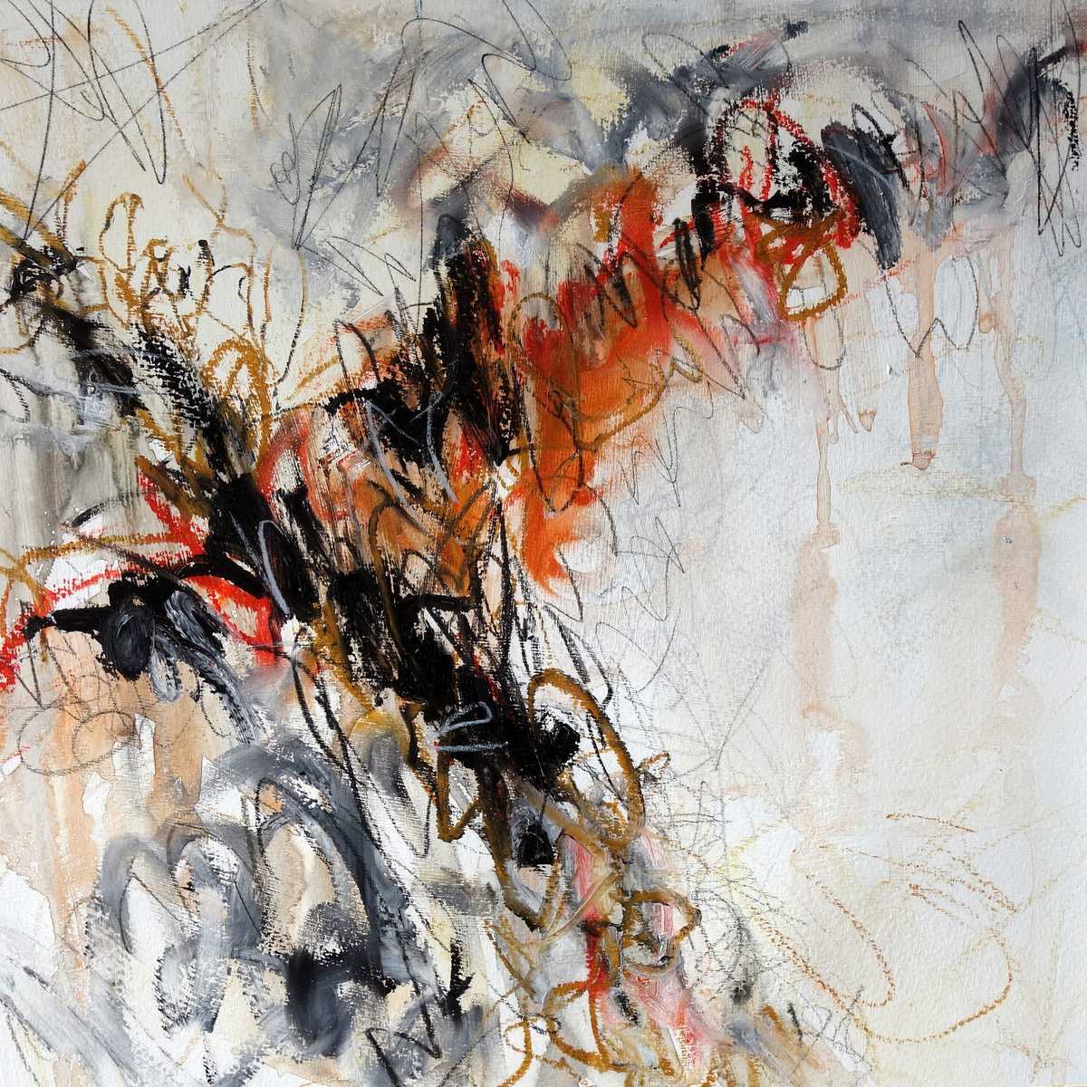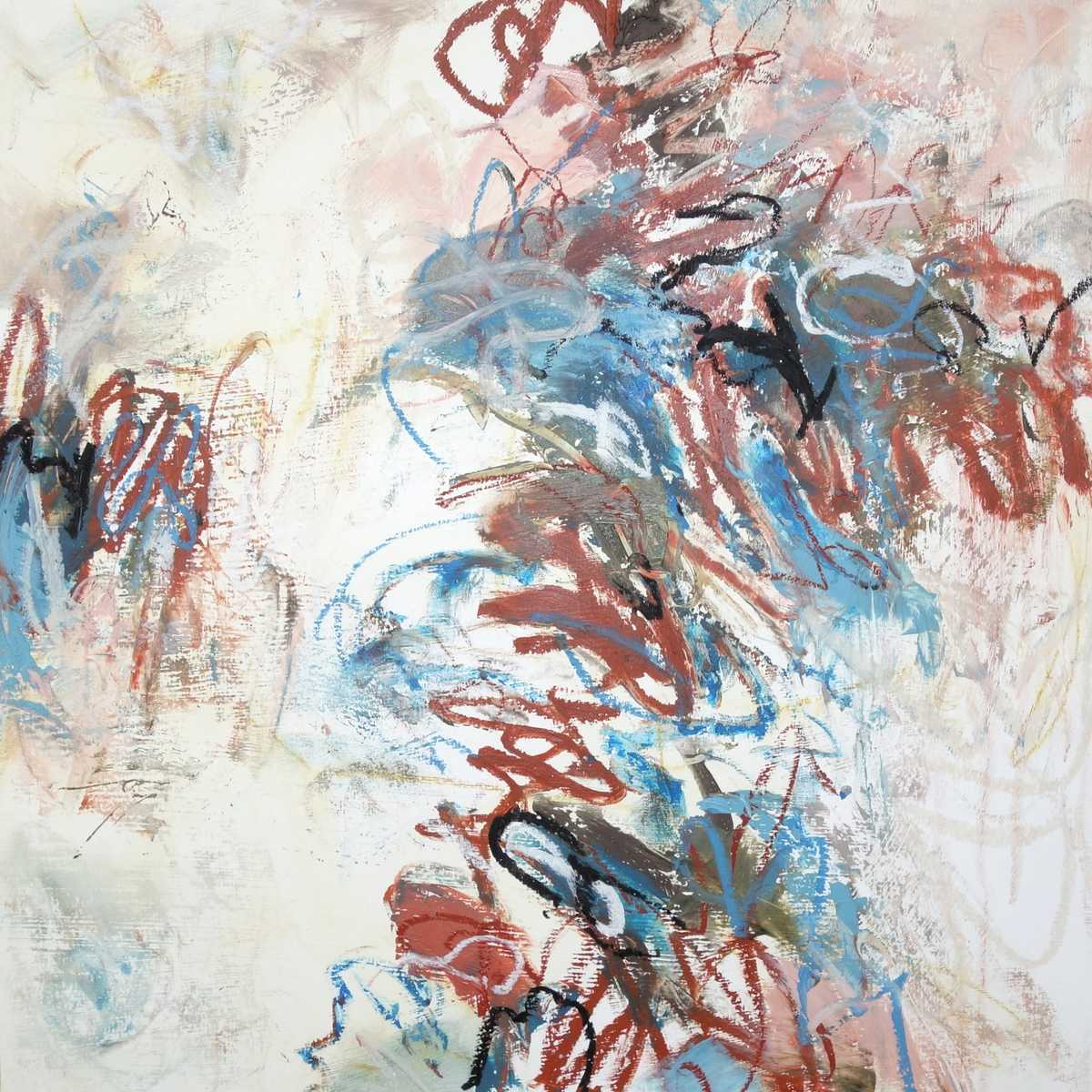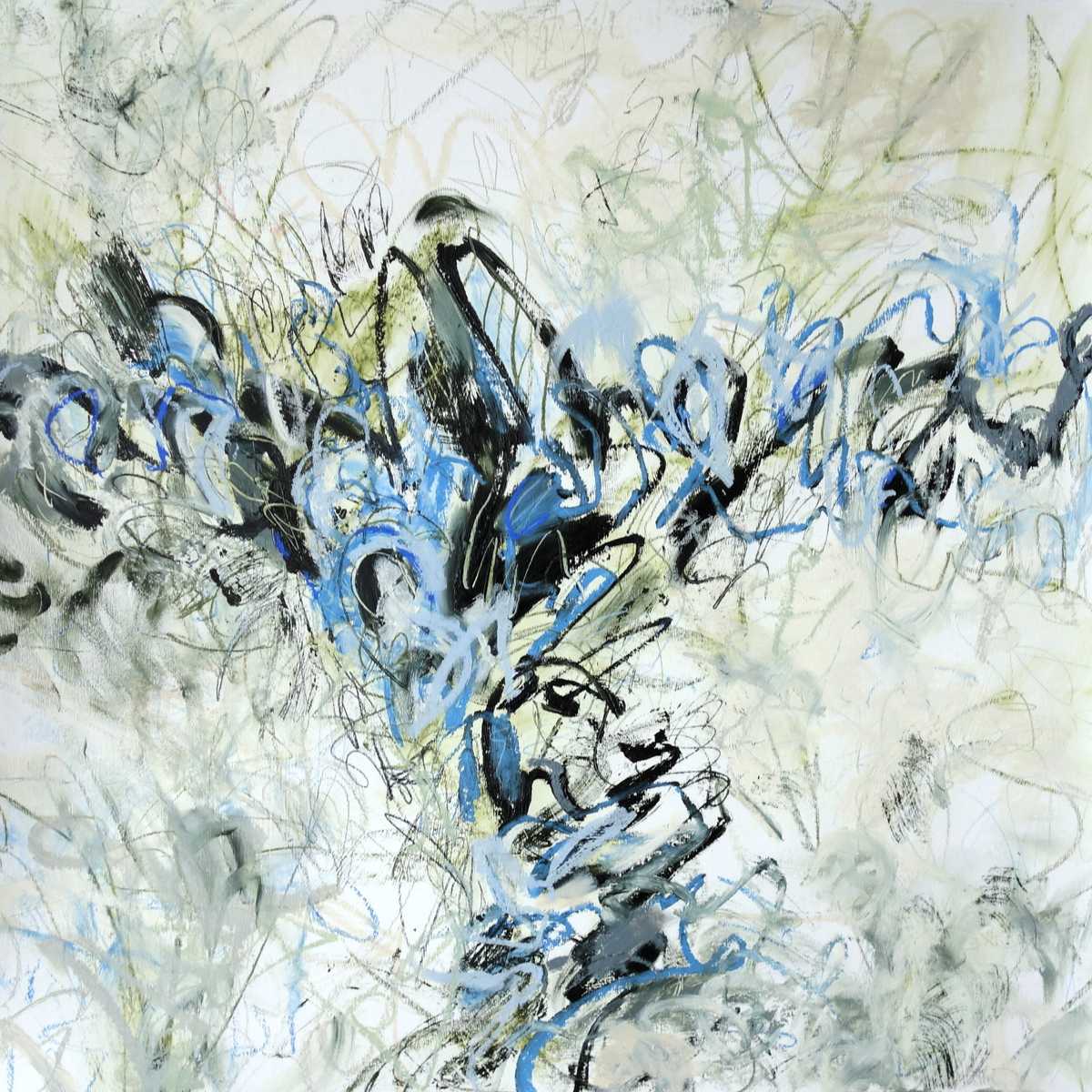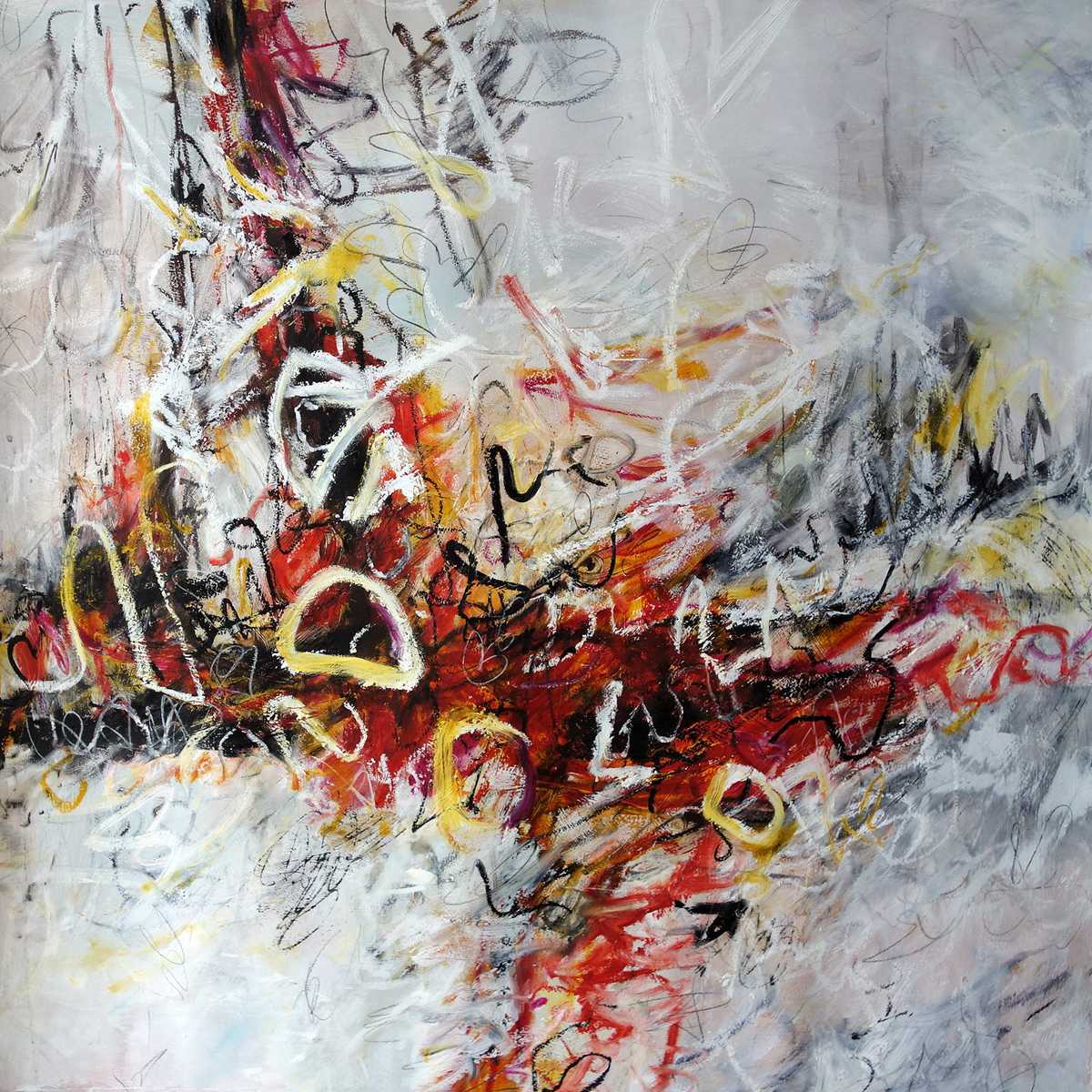 Working in a larger format on a wall allows use of my whole body to create gestural lines and marks. As usual I build up lots of layers of subtle lines and marks using a pre-determined limited palette. I work with a vague structure to get started. Oil sticks predominate, but crayons, oil pastels, oil paint with cold wax medium are also used.